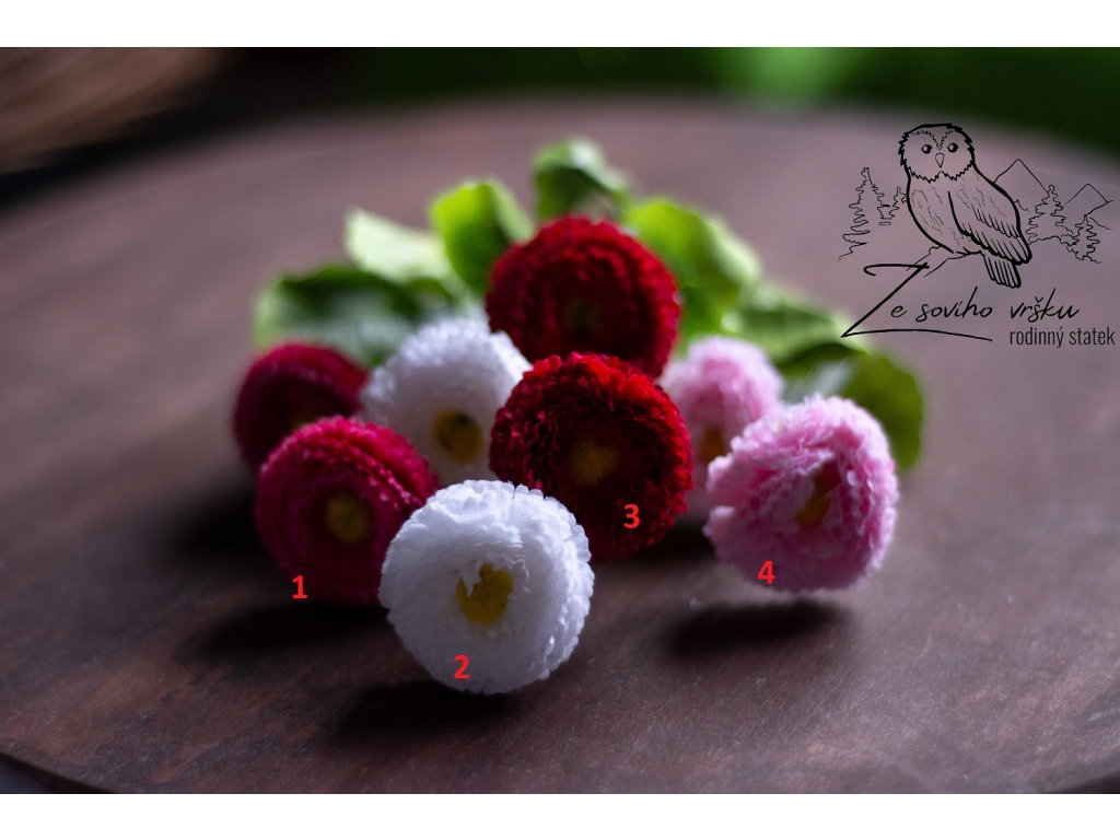 Sedmikrásky v nádherných pestrých barvách, krásně plné květy, výška stonku je cca 22cm. Na každém stonku jsou 2květy. Pro objednávku prosím napište do poznámky číslo barvy o kterou máte zájem. V opačném případě bude zaslán mix barev. SKLADEM POUZE BÍLÉ!!!